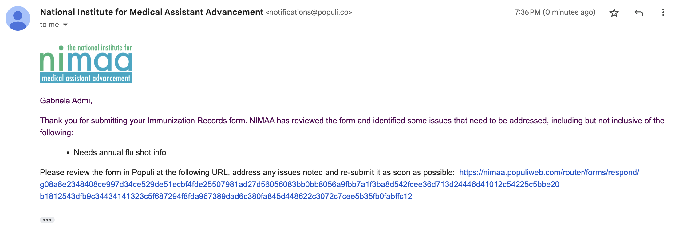 All of your onboarding forms will be reviewed by the NIMAA Admissions team. In some instances, NIMAA may request additional or different information for you to submit. When this happens, you will receive an email indicating that different or additional information needs to be added to your form with a link to that form (example below).