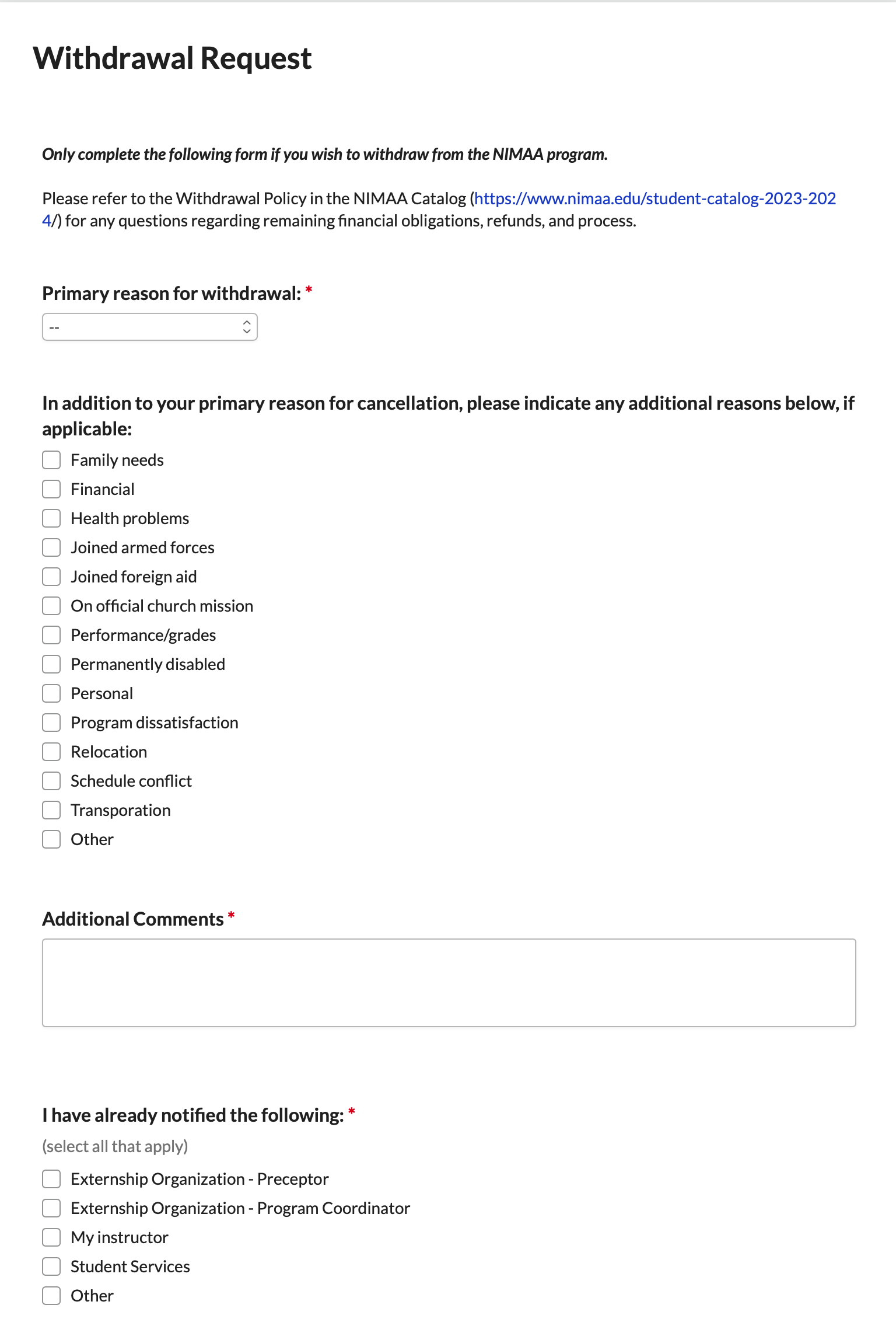 If you need to withdraw from the NIMAA program, please complete the Withdrawal Request form in Populi as instructed below. Please refer to the